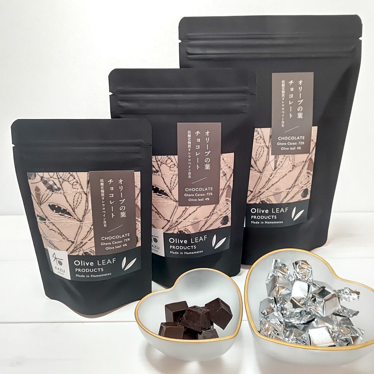 ガーナカカオを72%使用した高カカオチョコレートに、抗酸化力の高い「オレウロペイン」というポリフェノールをたっぷり含んだオリーブの葉の粉末を配合しました。